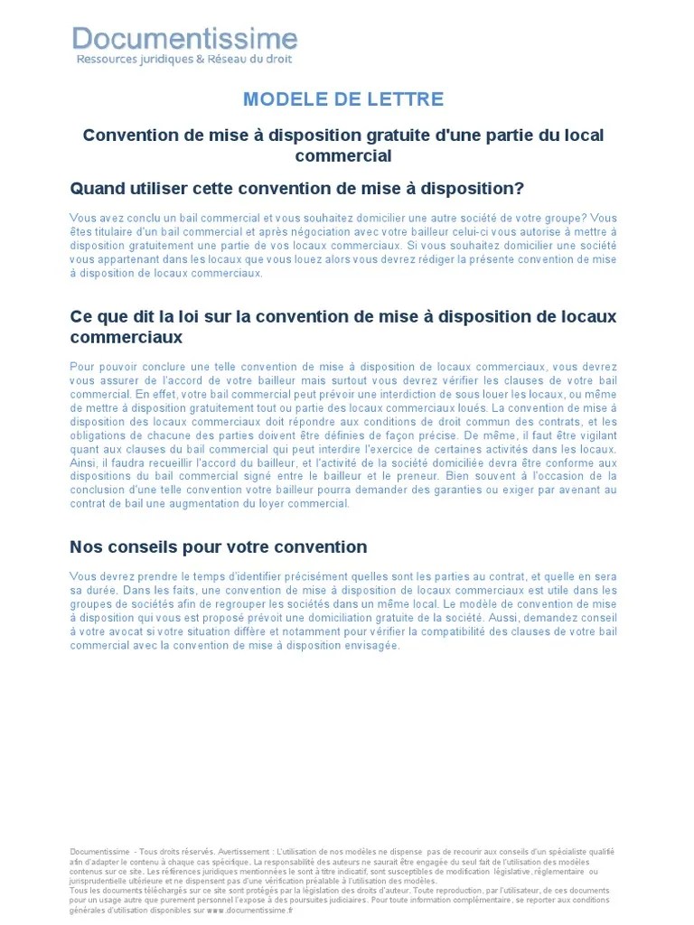 Il existe plusieurs modèles d'attestation, mis à disposition . Par ailleurs, lorsque le dirigeant loue le local qui lui sert d'habitation, . Ce dossier a été mis à jour pour la dernière fois le 16 avril 2020. Vous obtenez en quelques clics un . La mise à disposition des locaux est l'une des possibilités de la domiciliation d'entreprise. Pour des locaux commerciaux : Nos modèles de lettres sont entièrement gratuits et mis à jour . Cette attestation est ainsi adaptée que vous soyez dirigeant ou propriétaire des locaux mis à disposition de la société. Bonjour, stocker du matériel n'a rien à voir avec la domiciliation. Cette lettre type d'attestation de domiciliation couvre deux situations possibles : Agissant en qualite de : Pour cela, vous rédigez une convention de mise à disposition gratuite d'un local commercial. Avant toute conclusion, le locataire doit :